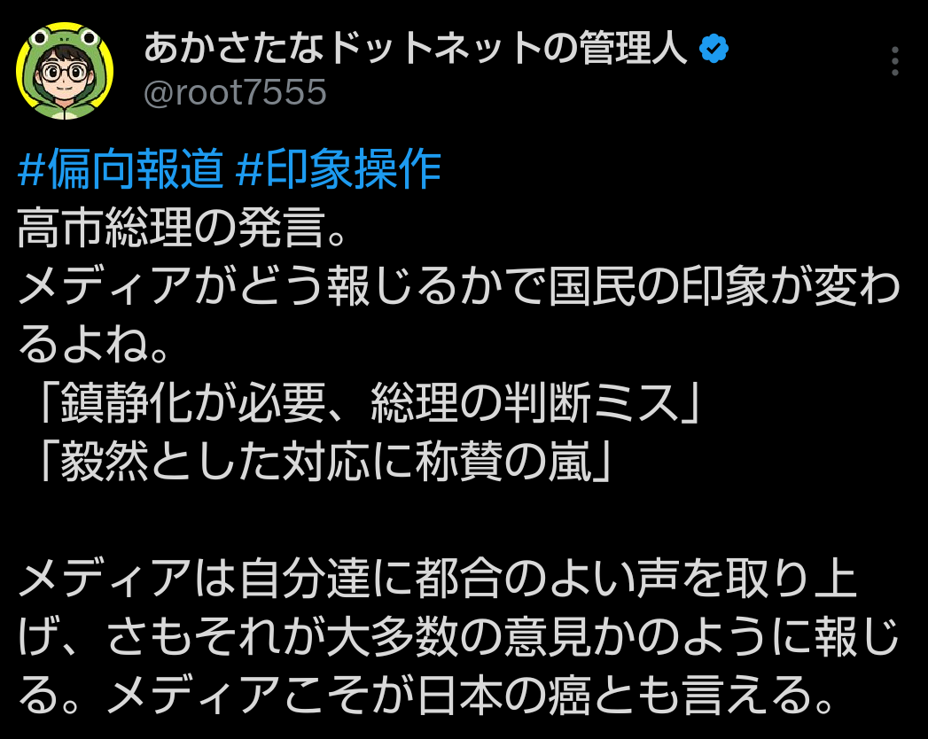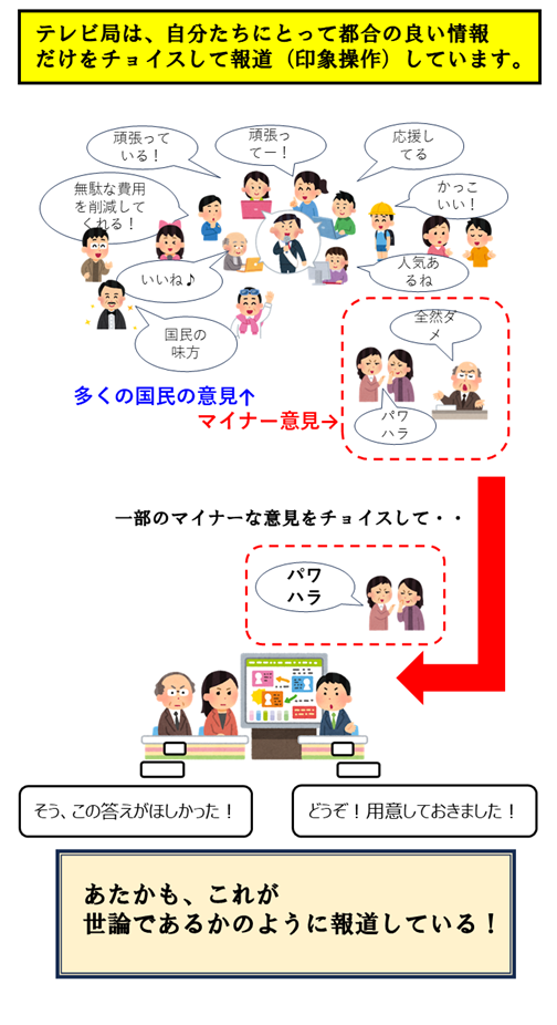 政治については人それぞれ意見や考えがあります。しかし、公共の電波で一方的な意見を発信するのは違うと思います。